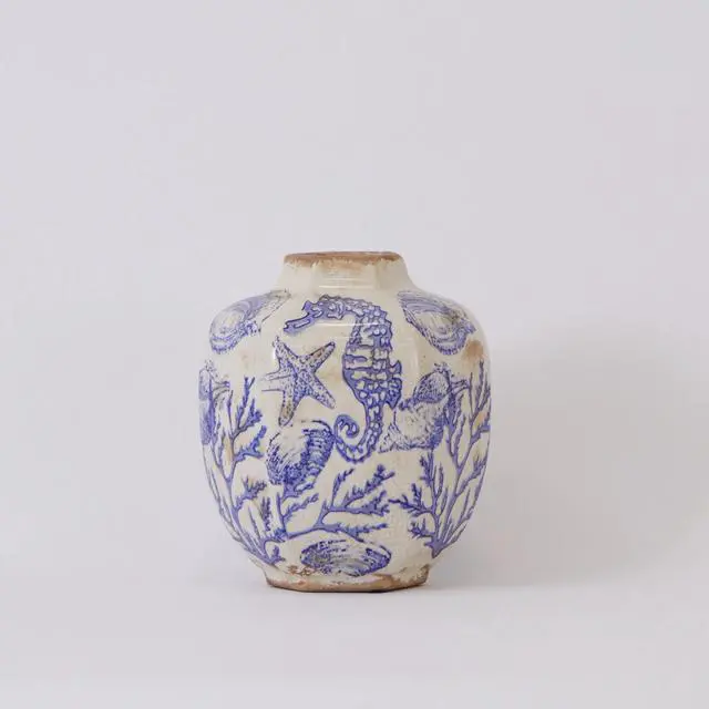 Create your own arrangement with this marine print urn (set of 1). The intricate blue marine pattern adds a burst of color and is contrasted by the lighter-toned hues. With a distressed, vintage look, this ceramic planter is perfect for rustic, coastal, farmhouse, and transitional homes that want to feel cozy and homey. No drainage holes and indoor use only.