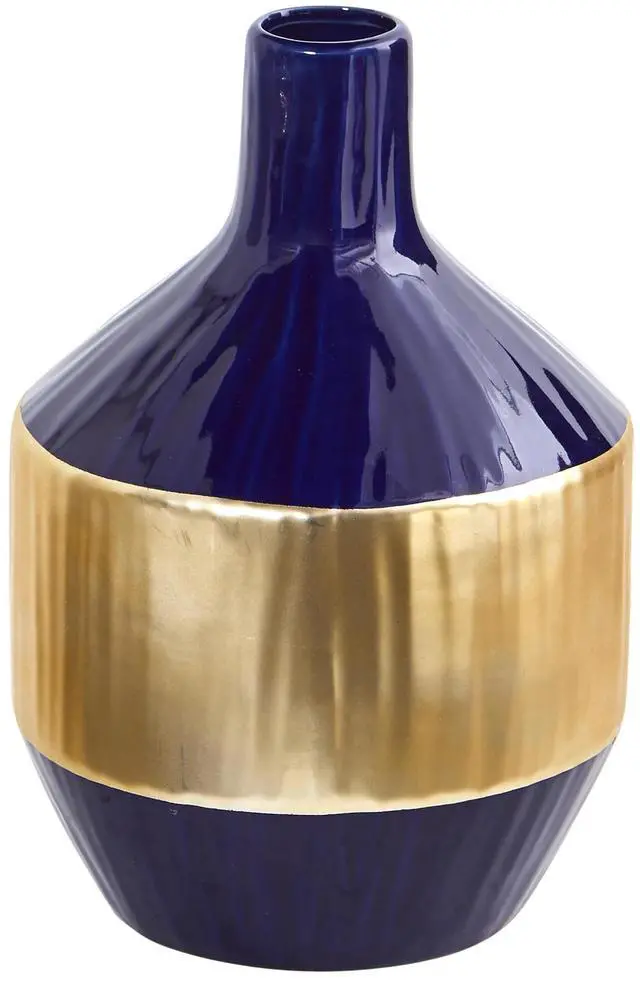 Bring the elegant, Hollywood glam look into your living areas with this blue and gold designer vase. If you're looking to inject subtle color into your space, DIY your dream arrangement effortlessly and quickly. The ceramic vase is perfect for housing stems, branches, or neutral-colored flowers. The gold creates a focal point that helps bring beauty to your spaceùstanding 9", DIY your next home accent.