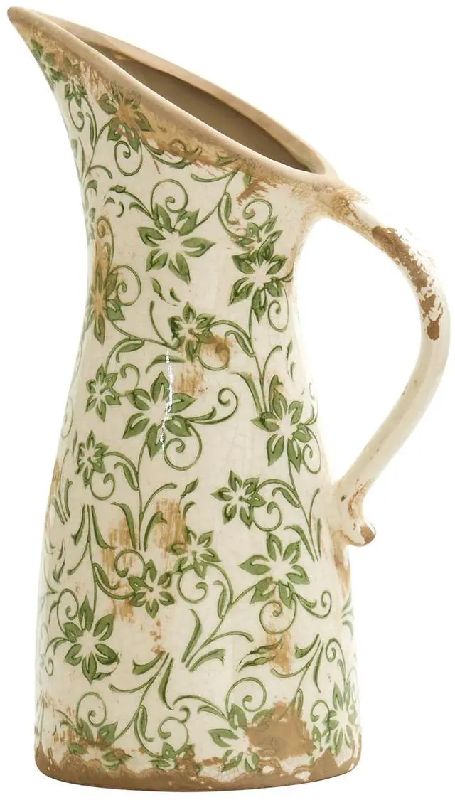 Arrange your fauxbolous flowers in this floral print pitcher. The vintage ceramic planter has a homey feel with its palette of green flowers against a rugged backdrop. DIY and have fun mix-matching for a country chic look that delivers that fresh farm to home style. No drainage holes and indoor use only.