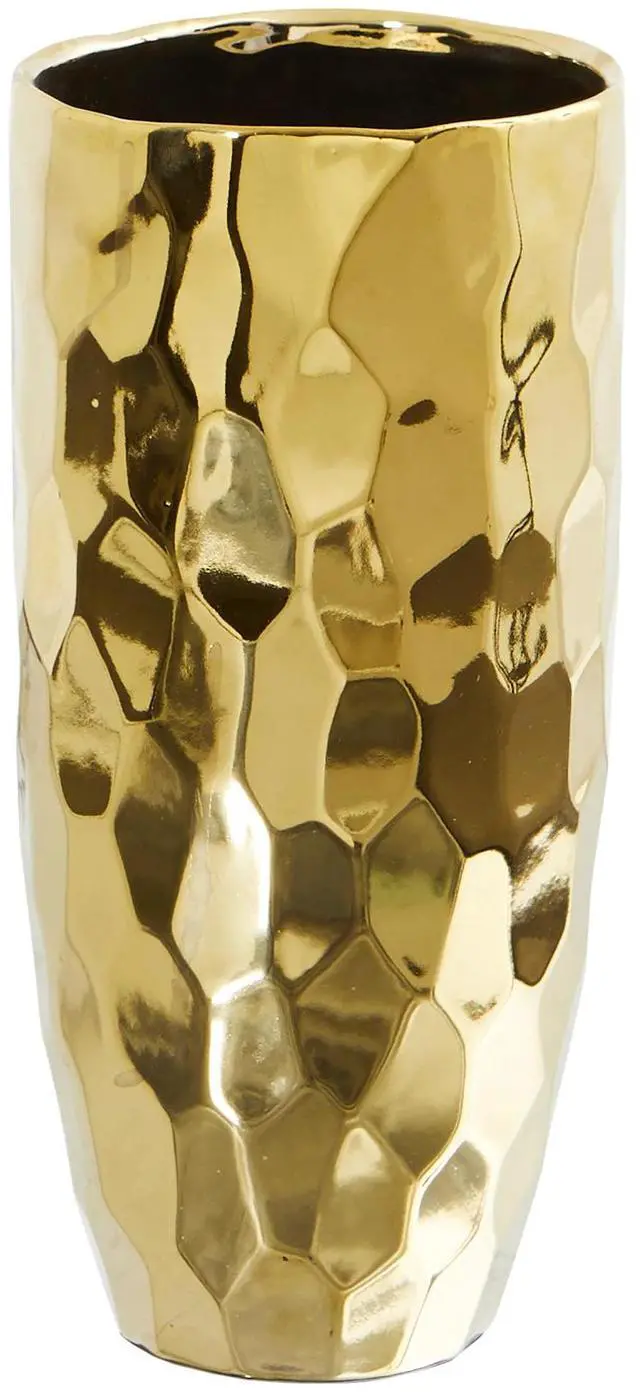 Add some glam to your space with this Designer Gold Cylinder Vase. If you want to bring attention to your greenery, look no further. Texture, color, and glare all in one. Perfect for Hollywood glam, modern, and many other dTcor styles. Standing 10", this tall cylinder vase will attract attention wherever displayed. House hydrangeas, roses or other flowers.