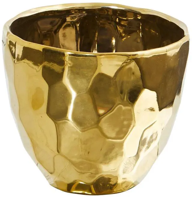 Add some glam to your space with this Designer Gold Bowl. If you want to bring attention to your greenery, look no further. Texture, color, and glare all in one. Perfect for Hollywood glam, modern, and many other dTcor styles. Reaching 6" in width, this bowl will attract attention wherever displayed. House hydrangeas, roses or other flowers.