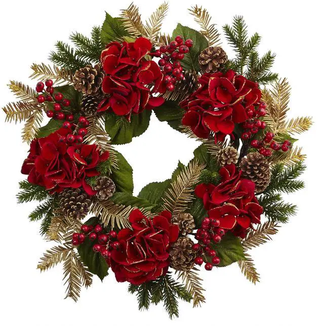 Gorgeous holiday hydrangeas in vibrant red blossom trimmed with gold against holiday green and gold pine leaves for a true seasonal statement piece. Hang at the front door to spice up the entryway for guests to marvel, or above the fireplace mantel for a holiday focal point everyone will admire. Berries, pine leaves and pine cones add depth and detail for a life-like appearance.