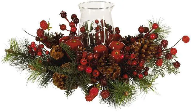 Jeweled berries, gleaming apples, rustic pinecones, and evergreen branches surround a glass hurricane candle base creating an elegant and functional candle holder. Standing 16 inches tall, it is substantial enough to take center stage on any table. Turn down the lights, light a fragrant candle, and enjoy the warmth and beauty of this exquisite piece.