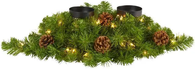 Set your home aglow this holiday season with the help of this artificial candelabrum; specifically designed as an elaborate candle holder, it's intricately designed from a rich overgrowth of realistic looking evergreens, handsomely accented with miniature faux pinecones, all carefully surrounding a trio of candle holders. Better yet, this seasonal centerpiece comes already pre-strung with 35 warm white lights, eliminating pre-tangled messes and holiday stress. Reaching 24ö long, this winter-ready decorative accent would make an enchanting addition to a mantle or a holiday-inspired tablescape.