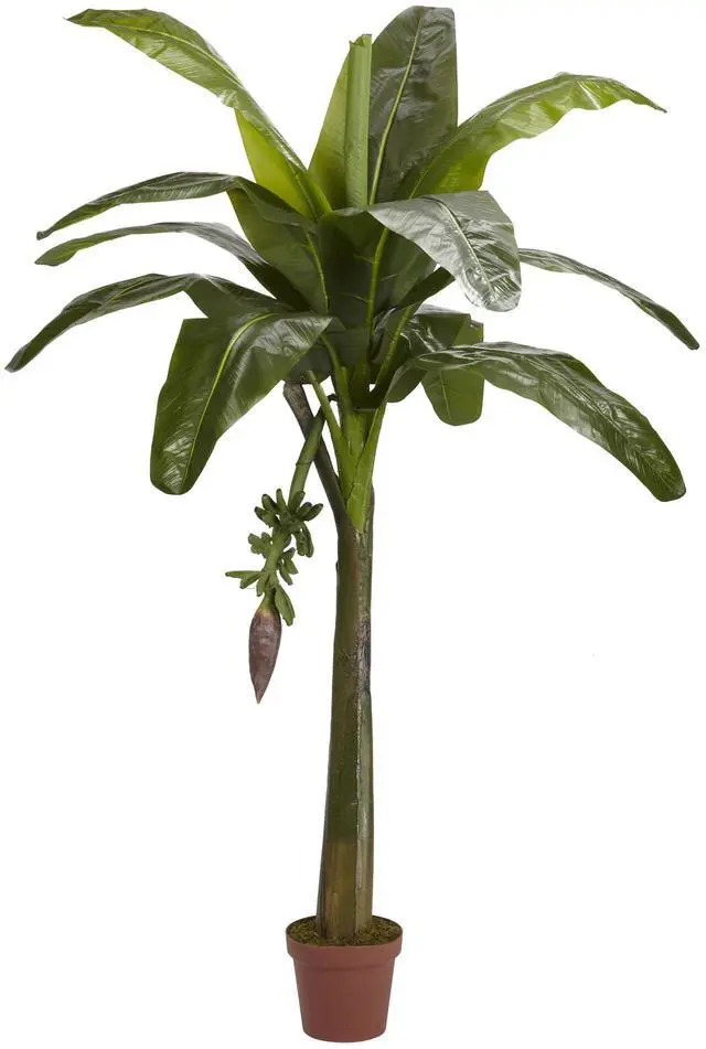 Break out the beach towel and dream of your own balmy tropical paradise under your very own 6 foot tall Banana Tree. Realistically-designed sturdy double trunks hold numerous large leafy vibrant green leaves up high. As a finishing touch, tiny sprouting green bananas are included to complete the illusion. Standing in a decorative pot, this tree is perfect for those wanting something just a bit different.