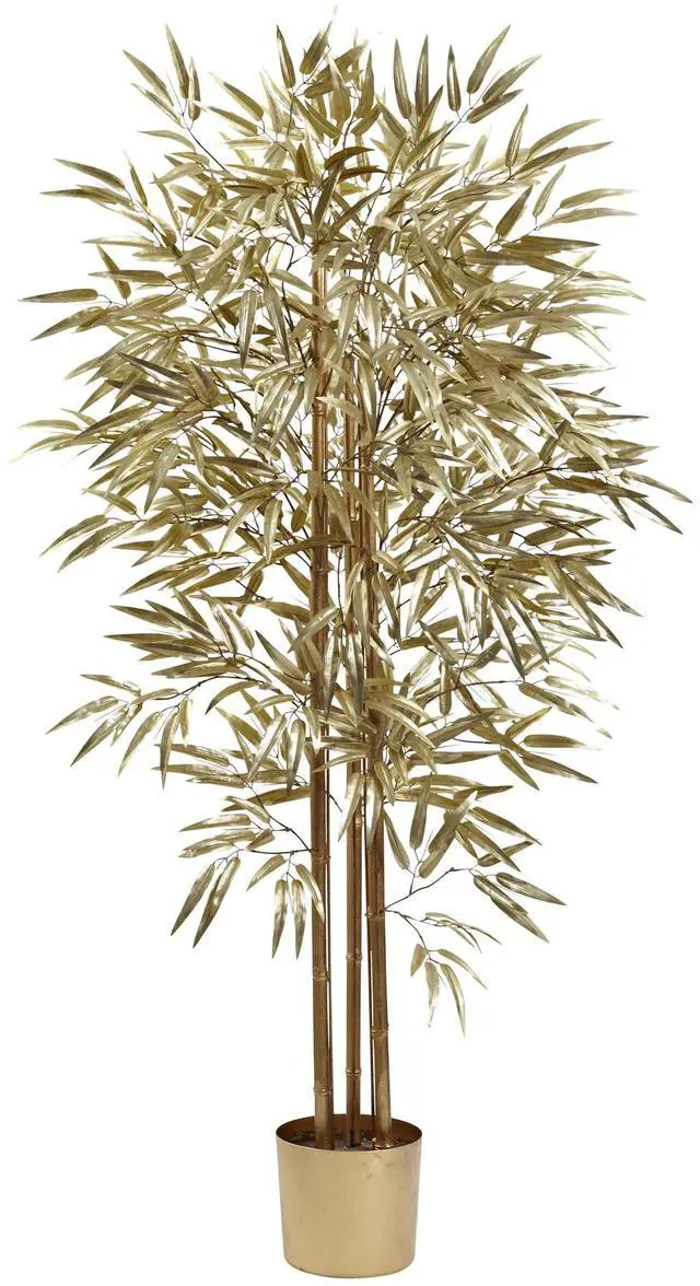 Reaching a striking five feet high, this beautiful Golden Bamboo Tree is a lush arrangement that showcases 880 vivid leaves cascading out from its decorative pot in a fountain of foliage. Each and every part of this tree is complete with a gold finish to add that extra bit of ôZingö to any dTcor. The long leaves create unique patterns, which look great from any direction. Best of all, there's no need for water or upkeep! Just find that perfect place in your home or office, and the rest takes care of itself.