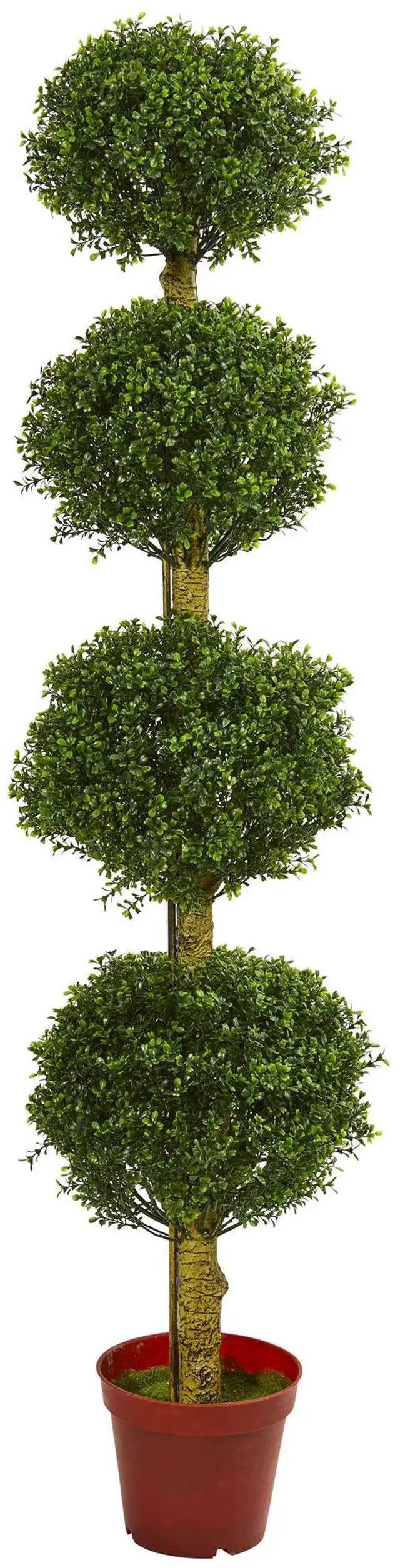 The 6' artificial boxwood tree contains four spheres. Starting from the top, the fullness of the topiary gradually increase in size as they move down the stalk. It's UV-resistant leaves allow for it to be displayed outside in a garden or just near a window.