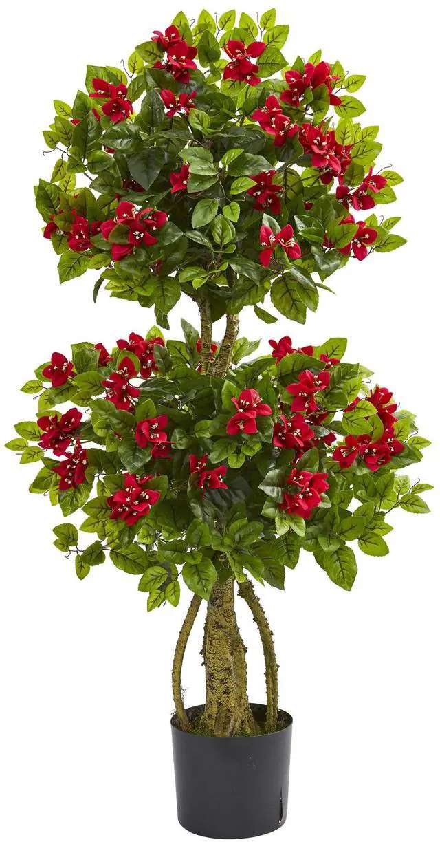 It's hard to determine where to start with this amazing 4' double bougainvillea topiary tree. Several trunks intertwine and extend upward to reveal two skillfully crafted topiaries that hang downward. It catches the eye with beautifully hued bougainvillea blooms and green leaves.