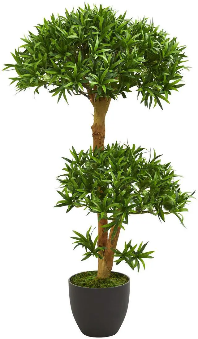This unique 3' bonsai styled podocarpus artificial tree has a unique trunk that grows into two heads, topped with podocarpus foliage. Place this fun piece on a table runner on your hallway table and pair it with a bowl of holiday ornaments for a fun, deconstructed Christmas tree look.