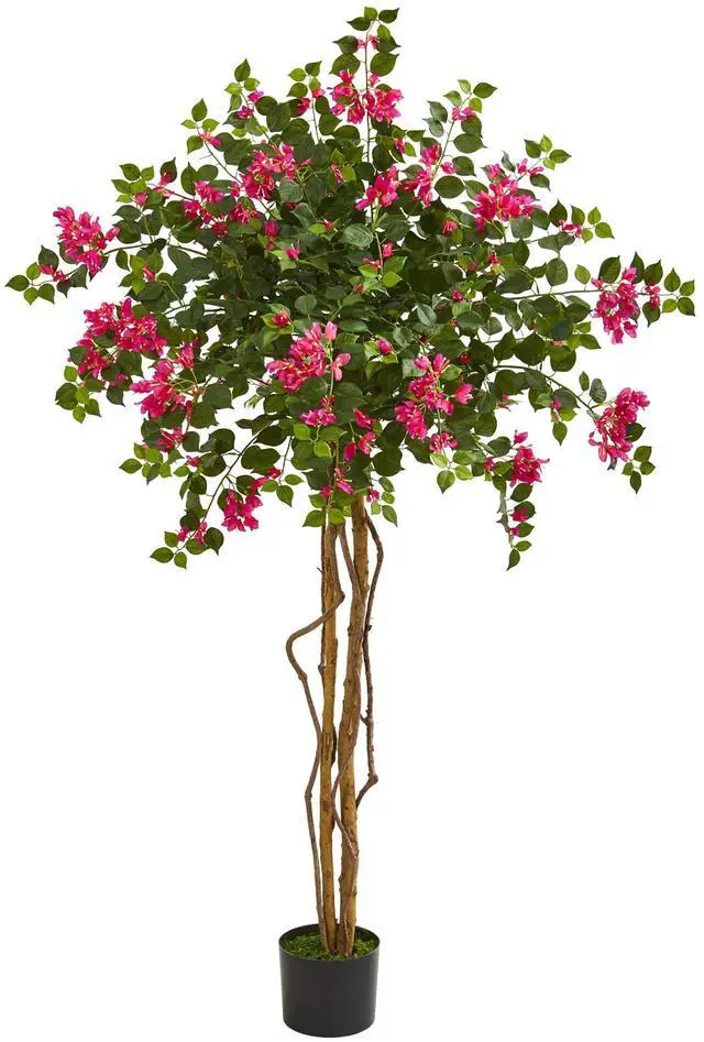 The unique look of this 5.5 ' bougainvillea artificial tree includes two trunks that have small, vine-like trunks growing up around them. A crown of leaves extends outwards with small, delicate branches and is topped with multiple purple blooms. Place this unique piece in the corner of your sun room next to your favorite armchair for a beautiful finish.