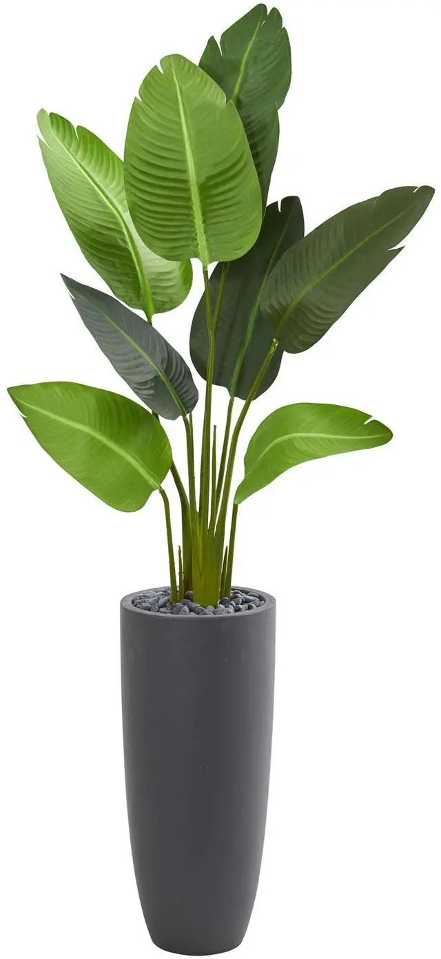 Made with close attention to detail, the green foliage of the traveler's artificial palm tree is large and ample in appearance--much like the leaves found in nature that are known to collect rainwater. It comes with a complementary, modern gray cylinder planter that makes it a perfect addition to an office setup. Place it next to a storage unit, book shelf, or a desk with dark vases for a sleek finish.