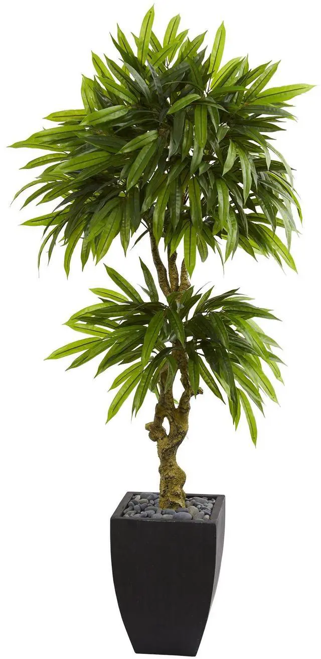 Realistic spears of lush green leaves fan out in two tiers over an intricate, well-crafted gnarled trunk. This lifelike mango artificial tree is created with care to look natural. With the included modern, minimalist black wash planter brimming with river rocks, it is a good fit for a contemporary office space. Place it near a large television monitor, digital dashboard, or other tech to add some life to a room. UV resistant this piece is perfect for indoor or outdoor use.