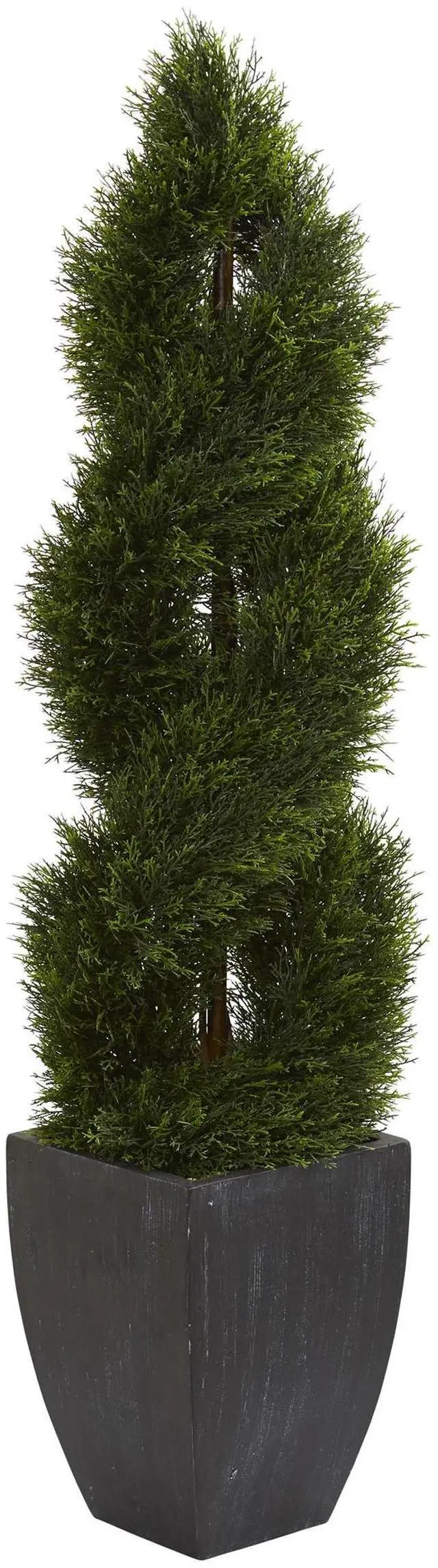 A pair of carefully manicured spirals of lush, plush foliage encircle each other, dancing up around a lifelike trunk. This artificial double spiral topiary is expertly made to look authentic and elegant in its black square planter. It makes for eye-catching decor in your office. Pick up a pair to flank the front door as this piece is UV resistant.
