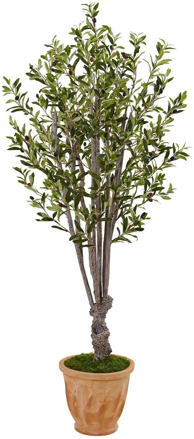 Bring the warmth of the Mediterranean into your home or office with this beautiful faux olive tree. Attention to detail and high quality materials are evident in every inch of this tree, from the lifelike leafs to the realism of the trunk. With a real terra cotta pot and natural green moss, this faux olive tree captures the feeling of summer all year long.