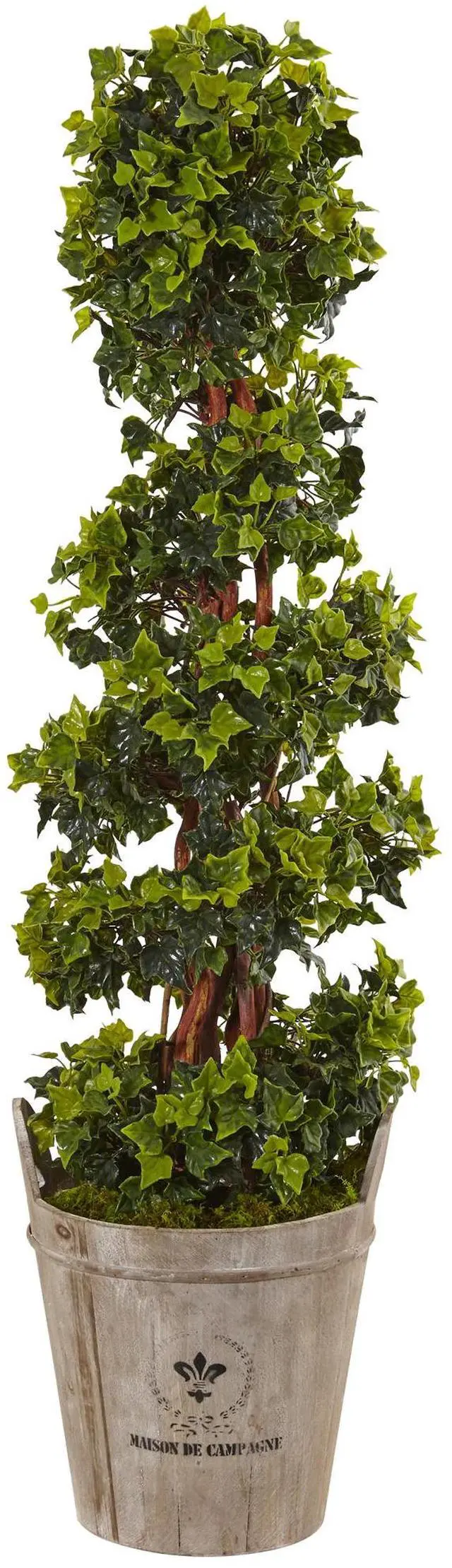 This artificial English ivy tree combines classic topiary with a wooden farmhouse barrel planter for a totally unique look. Both classic and charming, this artifical English ivy tree is at home in your living room as well as in the boardroom. UV resistant so perfect for indoor or outdoor use. Place a set of two at the entranceway of your home for a grand statement.