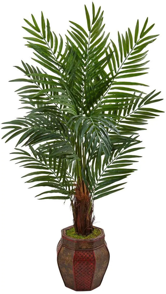 This is one of the most popular palms around, but this one is far less maintenance than most. No watering is needed for this faux areca palm tree and its beautiful lifelike green fronds spread out over a weave pattern wooden planter. Natural moss included.