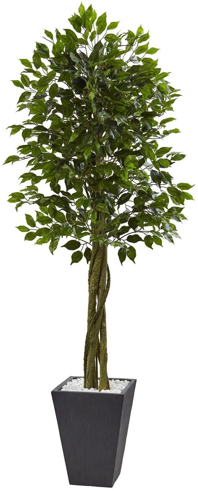 Gracefully drooping branchlets and glossy, oval leaves give this 6.5 ' Ficus Tree a full and abundant look. The intertwined trunk is keeping with the authentic ficus. Paired with a slate colored planter full of white pebbles for a decorative accent. Place this Ficus Tree in a study, entryway, sunroom, or patio for a year-round natural accent.