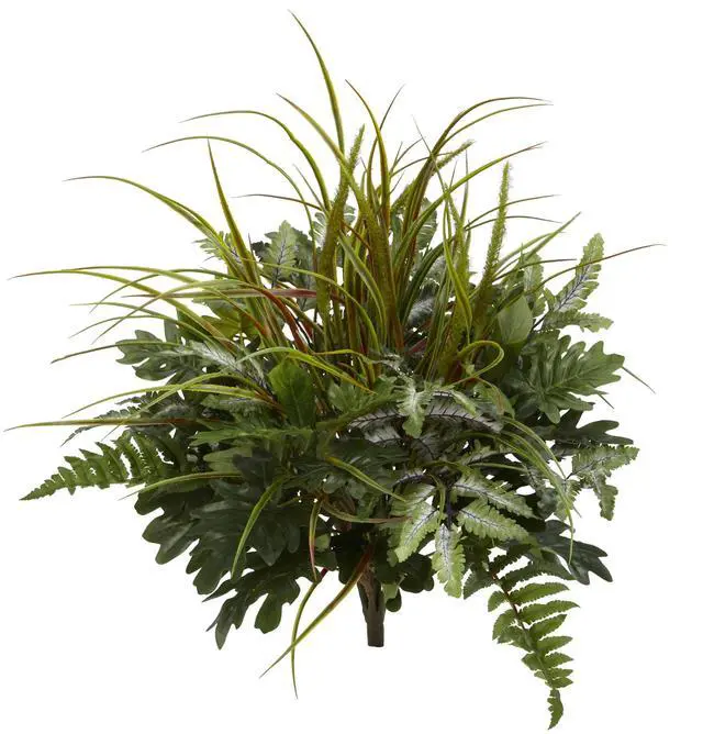 Wild and lifelike in appearance, the artificial long grass is combined with several other plants selloum philodendron, bracken, and leather fern; to give this plant's foliage a full, lush look. Add a touch of nature to your study room when you place this artificial plant on a desk, a low book shelf, or bench in a neutral toned pot.