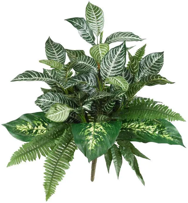 With mango fern, boston fern, diffenbachia and a zebra plant mixed in this exotic artificial plant is a sight to behold! From white stripes that follow the veins of some leaves, to the splatter of light yellow in the center of others, the lovely combination of variegated leaves make for playful patterns displayed across each individual plant's foliage in a unique display. Dress up your living room table by making this your room's centerpiece.