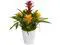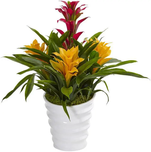 Broad green fronds give way to brilliant yellow and red faux bromeliads in this gorgeous arrangement. This would work perfectly as a dining table centerpiece or an accent in a office waiting room. Comes in a glossy white swirl vase with natural moss.