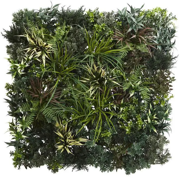 A mix of thick green foliage and small lifelike ferns makes this UV-resistant greens and fern wall appear almost lifelike. Suitable for both indoor and outdoor purposes, it can be used to dress up a bland wall. Place several of these three-foot by three-foot panels on a wall to make a fashionable, natural-looking accent wall.