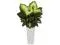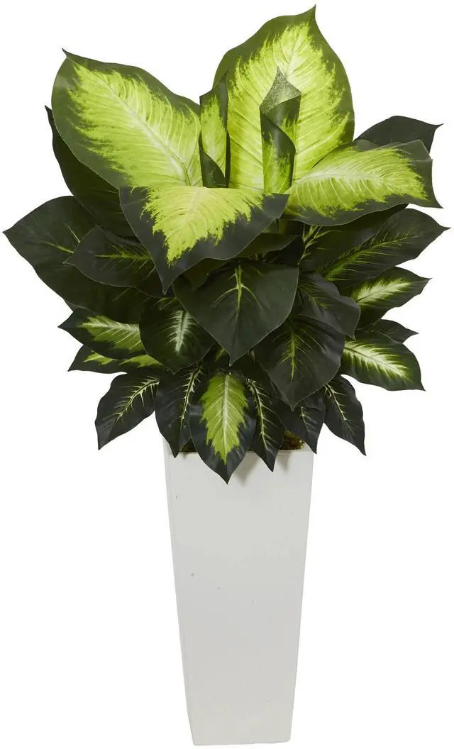 A central gold coloring blends seamlessly into green to create this stunning golden dieffenbachia artificial plant. With leaves that are tightly clustered together, it's a perfect ornament to bring depth into any room. A white tower planter is included with green moss.