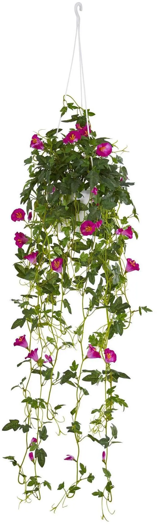 The colorful and vibrant artificial petunia hanging basket has soft purple blooms that are surrounded by a rich green foliage. The thick greenery flows over a white hanger pot like running water making it an excellent choice to brighten up a kitchen or sun room.
