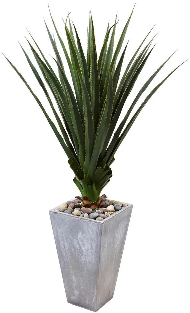 Bring the beautiful austerity of the desert to your home or yard with this faux spiked agave in a planter. The modern tapered cement colored planter has weight to prevent tips and style to draw the eye. The dramatic upsweep of the spiked agave is quite the attention-getter.
