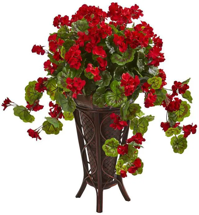 This 35-inch artificial geranium has dark green leaves that appear to grow up and over the included stand planter, spilling over the edge and nearly touching the ground in a beautiful and realistic display. The bright red flowers add a pop of color and are a fun contrast to the green leaves. This plant would look great welcoming your guests by the front door.