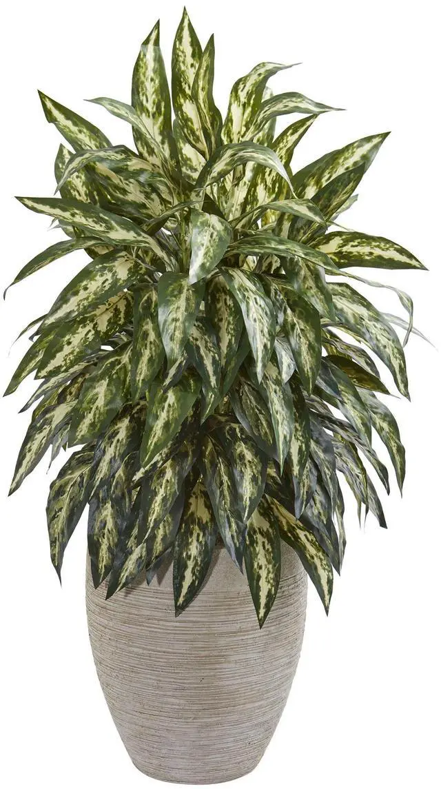 The artificial aglonema plant's vibrant greenery will liven up your bedroom, dining room, or loving room setup. It has many variegated leaves that overlap one another in stunning layers, leaving no space unfilled in the sand colored planter. For a lush tropical look, position this artificial plant on a side table with other flowering plants with bright blossoms that will accent it.