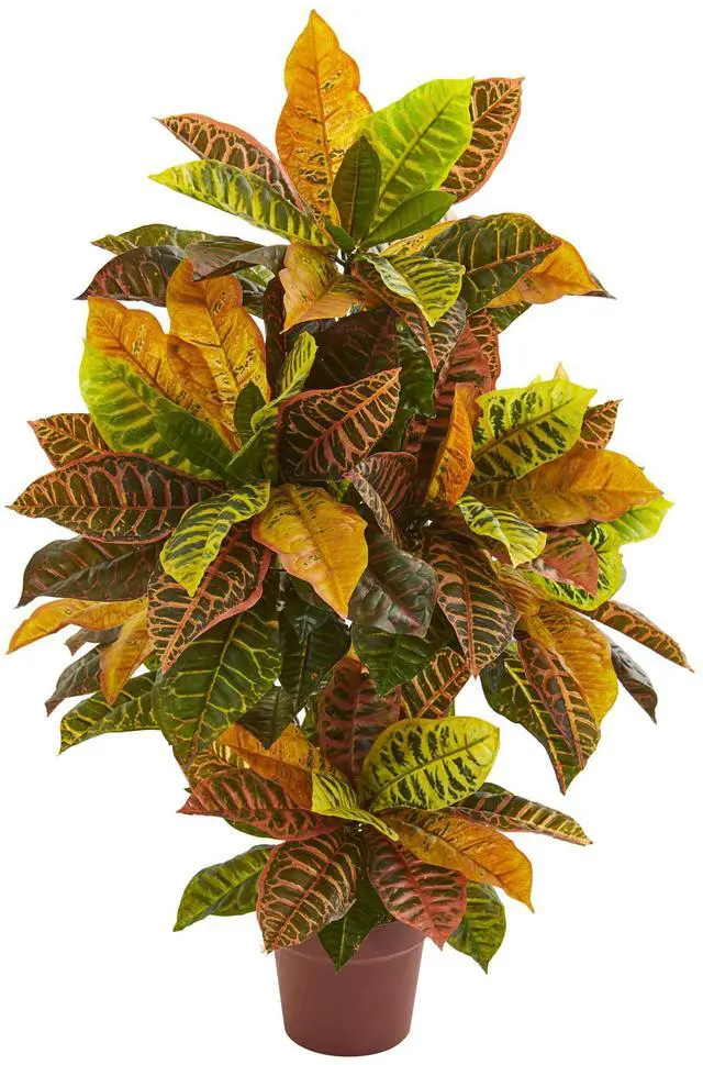 Several leaves in different shades of orange, yellow and green make up this croton variegated artificial plant. With multi-colored hues, this 37-inch piece will remind you of the sunset's stunning colors. Use it to bring a sense of serenity and relaxation to your bedroom space: nestle it on either side of your bed, vanity or dresser for a natural arrangement.