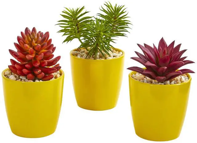 Sporting a stunning mixture of greenery, red and burgundy flowers, the artificial mixed succulent plant will add warmth to your living room's arrangement. Each piece comes fixed in a yellow planter that'll instantly add a cheerful, buzzing energy to this space. Place them together or separately on a built-in wall shelf above your entertainment system for a bright finish.