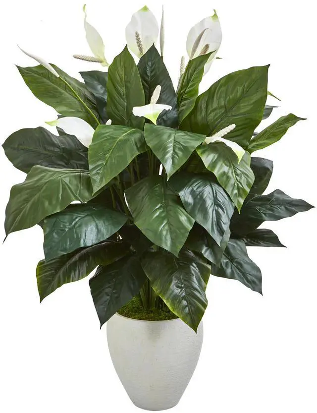 Multiple layers of large green leaves that have glossy surfaces fill up the included classic white planter with this elegant spathifyllum artificial plant. The white blossoms peeking out at the top give a more vibrant color to this piece. Use this 49-inch ornament to brighten up the arrangement on your entryway table or in any secluded room in your home. Its stunning beauty will last for years without the constant upkeep.