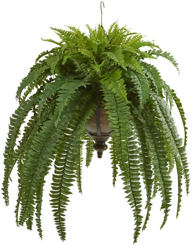 Showcase forest greenery all year round with this artificial hanging boston fern. Boasting natural looking fronds in a splash of vivid coloring, this 39ö tall plant comes with it's own hanging metal bowl. Easily movable throughout the house, you can display in a bare corner or window to create a sense of nature indoors.