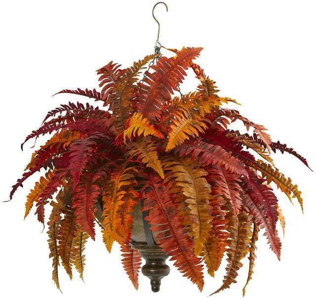 Autumn's hues come alive in this artificial boston fern plant. Designed with realistic fronds in seasonal fiery shades, this oversized plant is contained in a hanging metal bowl to easily display throughout the home. Reaching 28ö high, it makes a grand statement wherever displayed.
