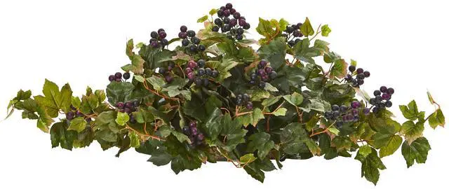 Create a garden-inspired theme indoors with this artificial grape leaf plant boasting a dense collection of dark green foliage, sprinkled throughout with small clusters of darkly colored grapes. Set on decorative foam for easy placement, this silk plant reaches 33ö in length.