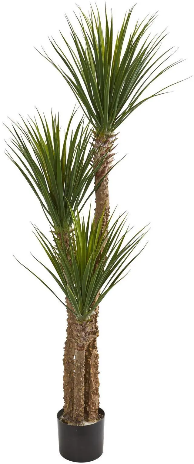 Slim and compact, this yucca artificial tree stands at 57 inches with its three thick and textured trunks. Atop these trunks are thin and sharp green leaves that are arranged to extend upwards. With its compact appearance, this artificial tree will bring color and texture to any corner in your home or office. Settle this tree in an intricately patterned vase to add some interest to its overall look.