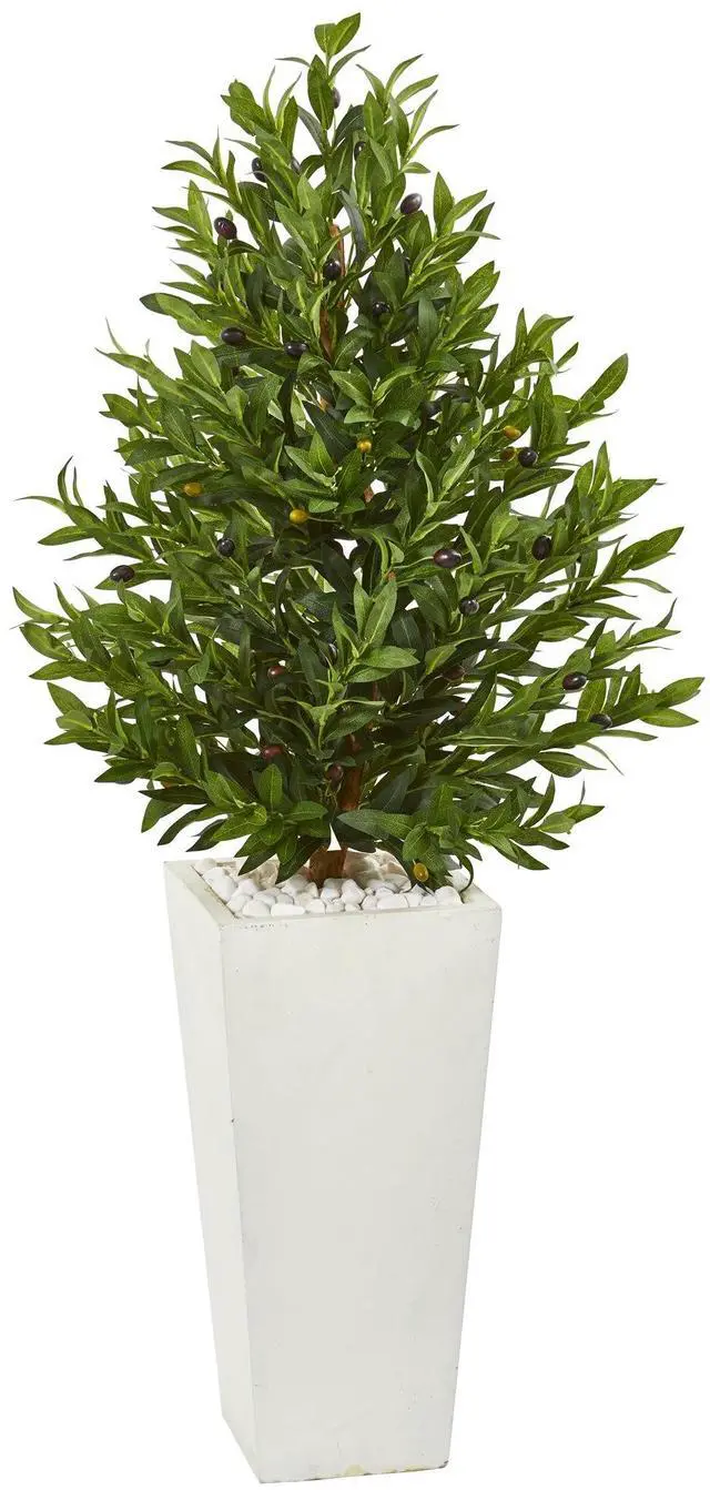The green, full foliage of this artificial UV-resistant 4' olive topiary tree stands within the included modern white planter. This four-foot ornament is ready to embrace the sunlight in your deck or patio. Position it next to your wicker love seat with floral area rug to sport a sophisticated finish. It will also look elegant and will give understated appeal when placed in the office or den. Comes with river rocks for a complete arrangement.