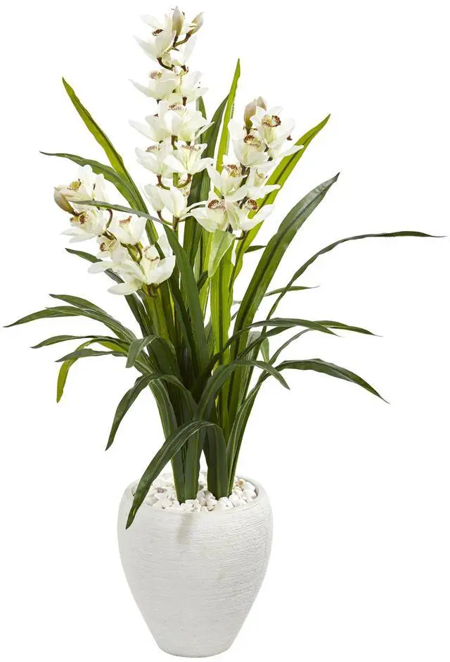 Natural beauty comes to life in the form of this artificial Cymbidium Orchid plant. Showcasing delicate light blooms with nearly natural petals and realistic looking leaves, this whimsy arranged plant alludes pure elegance. Standing 4' high, this lifelike plant is nestled in a modern white planter finished with natural tone rocks.