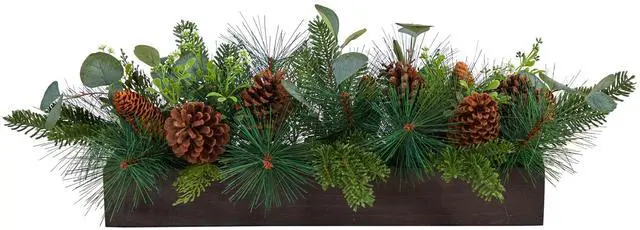 Set the scene during Christmas dinner with this Christmas-inspired arrangement. Crafted from high-quality materials, the evergreen pine and pine cones are inspired by nature for a realistic look. Add this piece for when you want to create an epic tablescape during the holidays. With a width of 30" add to any table in need of Christmas cheer. Makes a fine gift, as well.