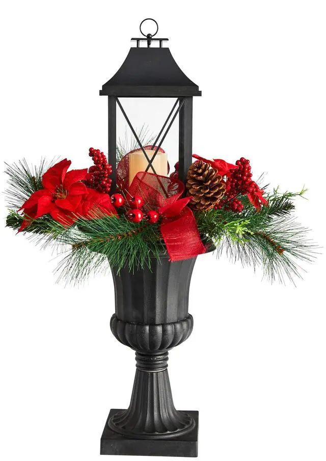 Get cozy during the most wonderful time of the year. Set the scene, smell the scents of the season with this Christmas-inspired lantern that looks straight from a holiday movie. Soft-hued evergreens are accented by berries and poinsettia, inspired by nature; this piece is incredibly lifelike. Crafted from high-quality materials, this lantern will last awhile. Standing 33" from an urn (included in height), house in any space in need of holiday cheer. Perfect for an outdoor patio, dining table or kitchen nook.