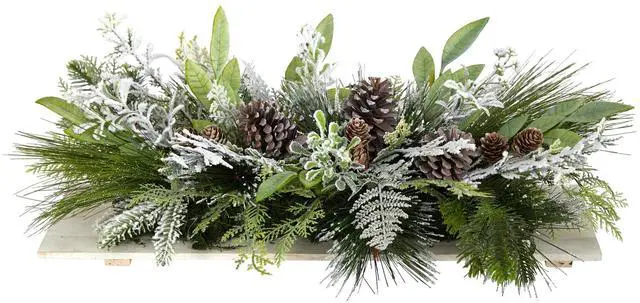 Are you into trendy dTcor? If yes, you'll faux for this artificial arrangement. Flocked evergreen leaves with distinct textures point in different directions for a messy yet modern look. Accented by faux snowed pinecones that inject color and subtly calms the look, add a natural touch to any tablespace. With a length of 26" add to any holiday-inspired space. Makes a fine gift in any