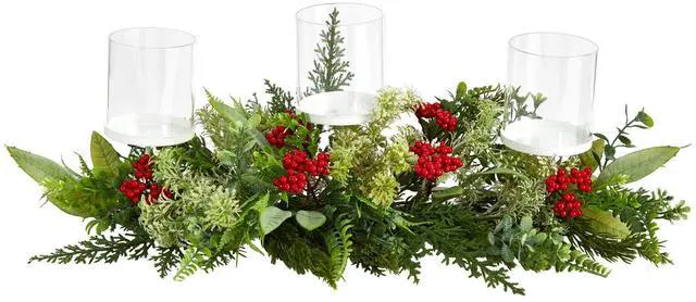 Create a cozy wonderland during the holidays with this Christmas candelabrum. Decorative yet, festive, soft-textured evergreens in different shades are accented by berries, inspired by nature and made from high-quality materials. Set the scene and add your favorite candle. With a length of 20", add a seasonal touch wherever displayed. Perfect for a Christmas dinner table.