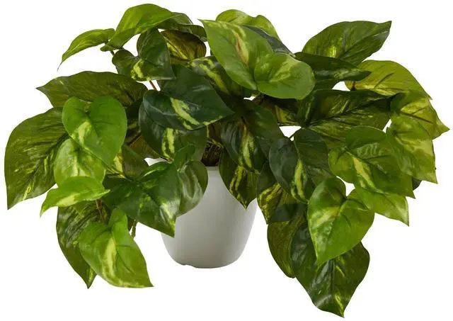 If you're into the jungle look, you'll go wild for this Pothos Artificial Plant. The trailing fake plant has cascading dense, green foliage of silky, vine-like leaves û that overflow from the planter and feel real to touch. Standing 9', from a white planter (included in height), this trio is the perfect addition for bookshelves, home offices, or lonely windows. Enhance the look by pairing with a Monstera or Fiddle Leaf Fig and complete your jungle-inspired space.