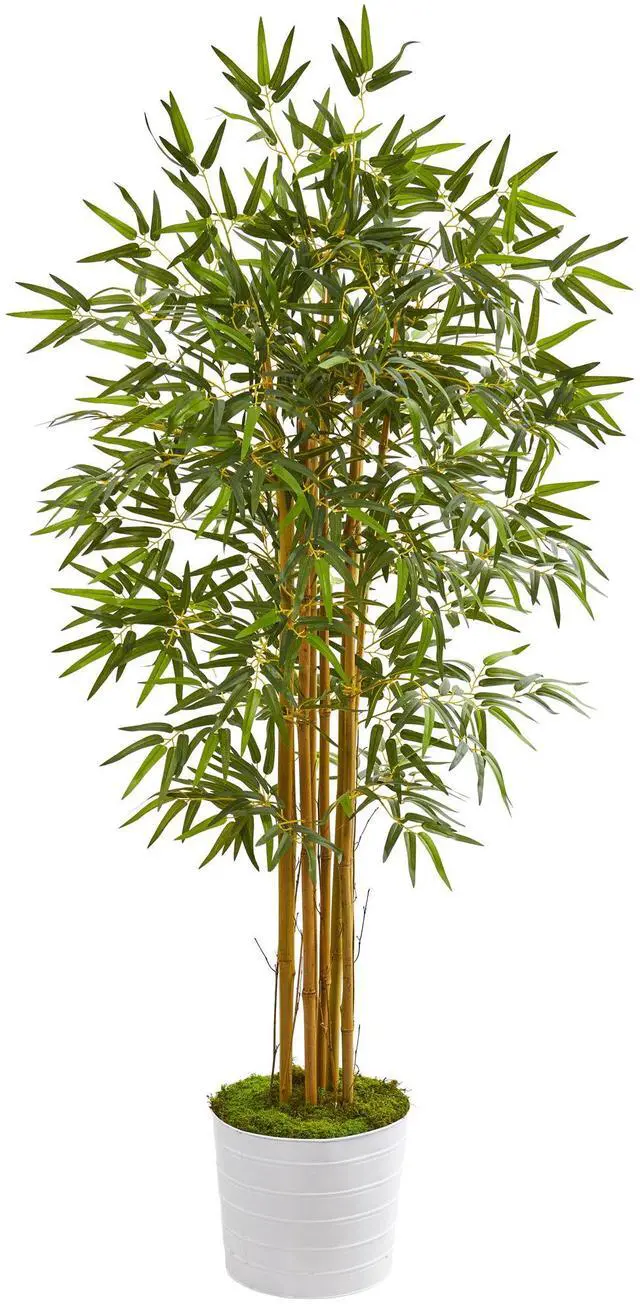 Brighten up a dark space with this artificial bamboo tree made up of countless realistic looking foliage intricately designed in vibrant, green hues, stemming from various textured trunks. Standing 5' high from a white tin planter, this silk tree will instantly freshen up any environment it inhabits.