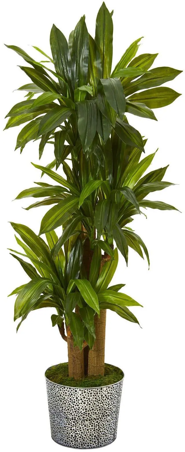 Incorporate lifelike greenery into your decor scheme with this artificial corn stalk dracaena plant boasting a plethora of brilliantly detailed leaves in naturally occurring hues, stemming from realistic textured trunks - all of which feel real to the touch. Reaching 58ö high from a black embossed tin planter, this fake plant evokes a hint of the exotic wherever displayed.