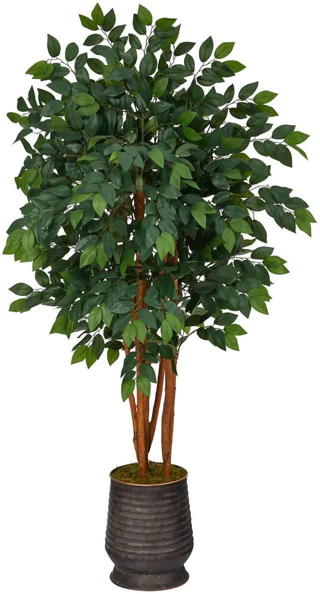 Are you looking for some Zen in your space? Bring an oriental touch with this Sakaki Artificial Tree - native to the tropical regions of Japan, Myanmar, and Nepal. Elegantly showcase green, variegated leaves from slender bendable branches that arch from 3 braided, slim trunks. Standing at 57", housed in a rustic ribbed metal planter, this appealing tree gives spaces such as kitchen nooks, living rooms and offices a refresh. Start relaxing today.