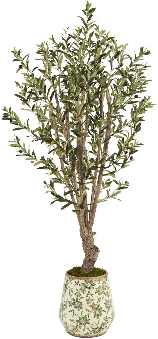 Add hints of delicate greenery to any space in your home or office with this artificial olive tree showcasing a flurry of wispy, lifelike leaves accented throughout with a sprinkling of realistic looking olive berries. Standing 62ö high from a floral print planter, this handsome fake tree would beautifully enhance any space it inhabits.