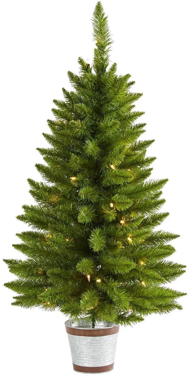 Create a traditional Christmas scene even in the smallest settings with the help of this easy and effortless artificial Christmas tree! Completely maintenance-free, this realistic looking fake Christmas tree boasts tiers of evergreen foliage made up of 114 easy-to-bend branch tips for showcasing your favorite holiday ornaments. Arriving pre-strung with 50 warm white lights to eliminate tangles and carefully stabilized in a metal planter, this versatile 3' tall artificial Christmas tree will not only make decorating a breeze but ensure your home is always holiday-dressed for years to come.