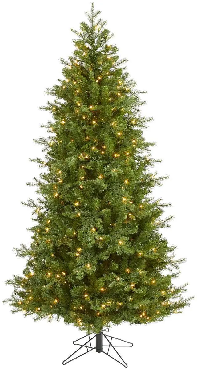 Create a traditional Christmas scene without the need for upkeep with the help of this easy and effortless artificial Christmas tree! Completely maintenance-free, this realistic looking fake Christmas tree boasts tiers of evergreen foliage made up of 843 easy-to-bend branch tips for showcasing your favorite holiday ornaments. Arriving pre-strung with 450 warm white lights to eliminate tangles and carefully stabilized on a metal stand, this handsome 7' tall artificial Christmas tree will not only make decorating a breeze but ensure your home is always holiday-dressed for years to come.